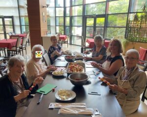 CĂ©line, animatrice de la rĂ©sidence, a proposĂ© un atelier cuisine pour prĂ©parer les brochettes tomates-mozzarella et la salade de fruits. đ