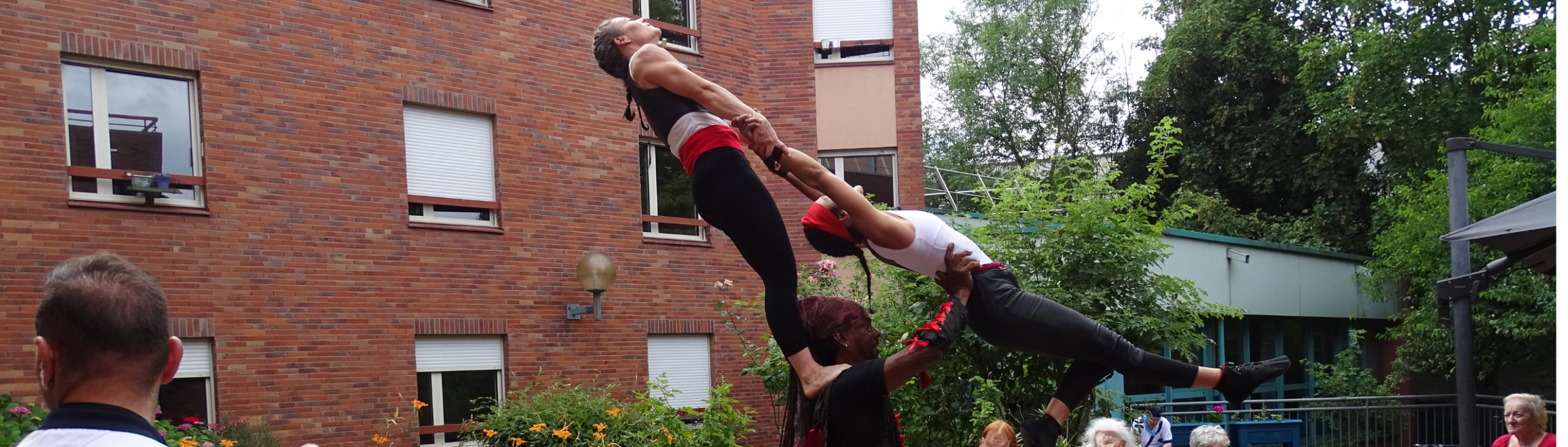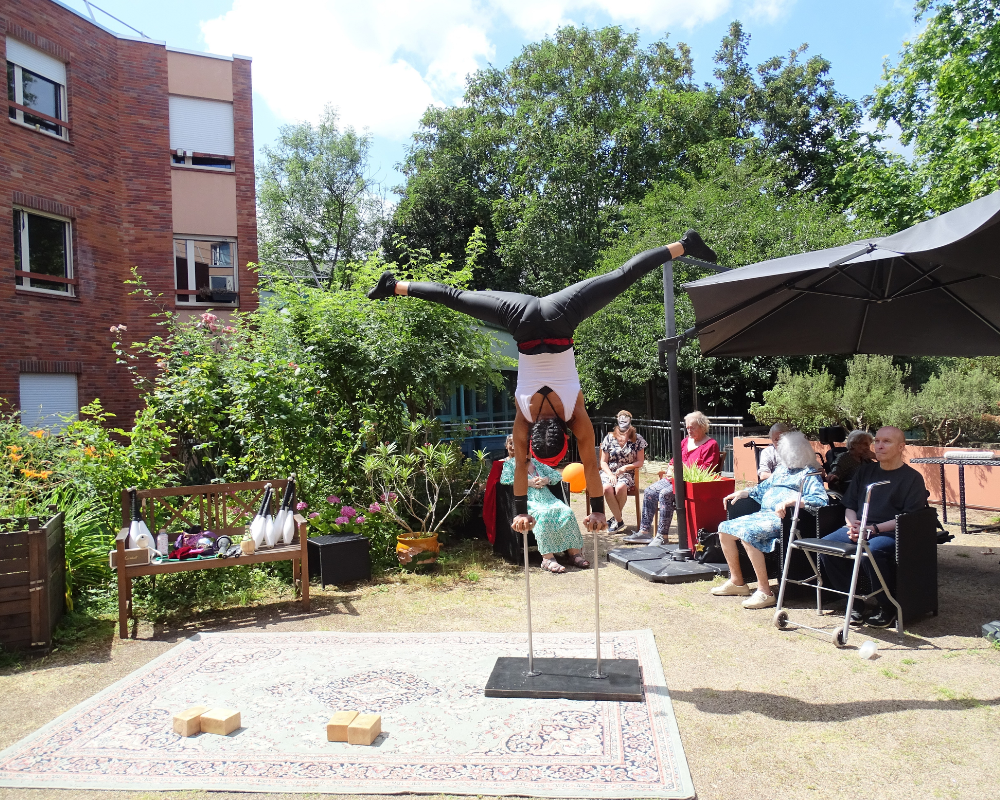 Trois acrobates ont investi le jardin de la résidence pour une démonstration de leurs plus belles figures. 🤸♀️